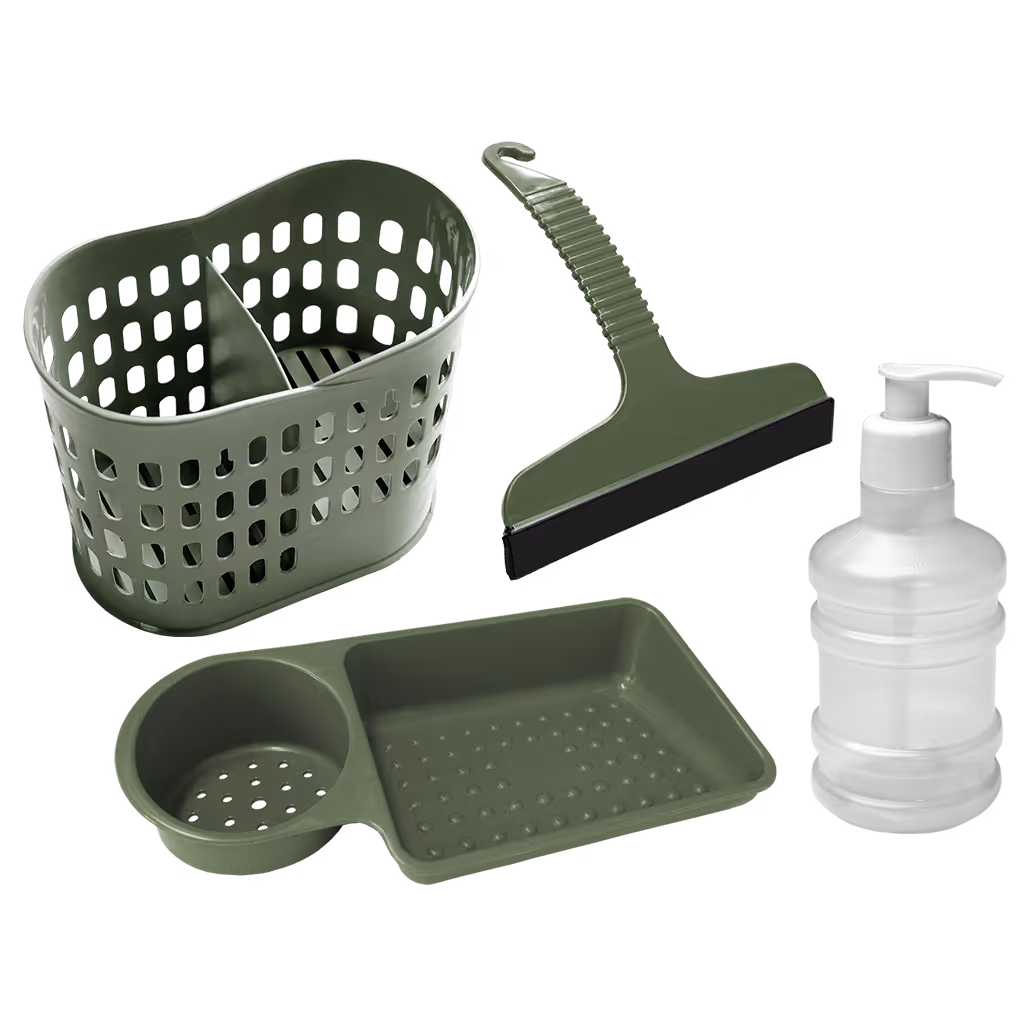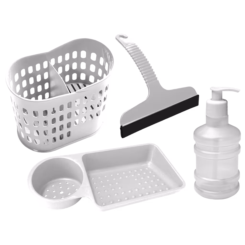 Conteúdo: 1 Organizer (Ref.: 292) | 1 Organizador de Pia (Ref.: 140) | 1 Rodo de Pia (Ref.: 101) | 1 Saboneteira Galão (Ref.: 624)